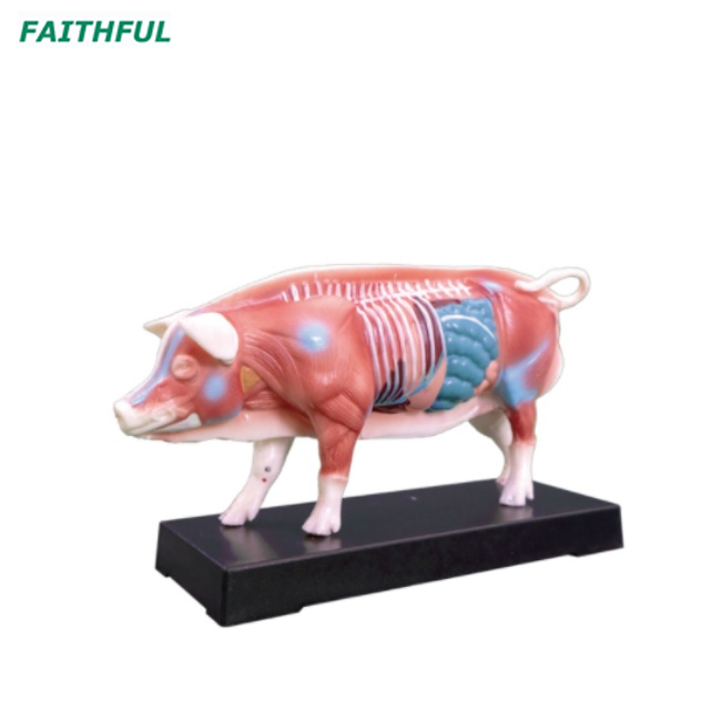 La moitié droite du modèle montre la constitution d'un sanglier blanc Shanghai et 55 points d'acupuncture souvent utilisés sur la tête, le cou, les fesses, la queue et les membres. La moitié gauche montre les muscles de la couche superficielle et la section longitudinale de la colonne vertébrale dorsale et des organes internes. En plastique PVC. Utilisé pour la référence du vétérinaire.