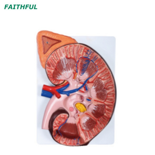 Ce modèle montre 3 fois agrandie du rein, avec des adrénalgiens, 2 composants, montrant le cortex rénal, la médullaire rénale, le tubule alambiqué proximal, le tubule alambiqué, les mineurs de médullaryloop, le conduit et le canal papillaire, le calic Pelvis, uretère, artère interlobulaire, veine, artère rénale, veine et rénicapsule.