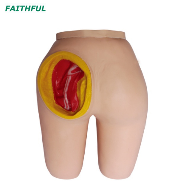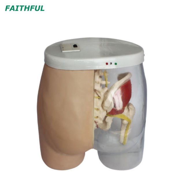 Ce modèle avec une peau réaliste est parfait pour enseigner les technologies injectables appropriées et comment éviter les nerfs et les veines. Le plus haut à la hauteur du mode montre la structure interna, y compris les os, les snerges muscles et les veines. Le gluteus medius, les nerfs, Trochanter peut être palpé pour confirmer les points d'iniction corrects. Le fluide injecté à l'endroit approprié est déchargé à travers le tube Adrain dans le sac de vidange, une lumière Areen indique une inisection deection correcte et un positionnement - un buzzer et des guerriers de lumière rouge clignotants s'ils sont allés trop profondément ou si la position de l'aiguille est incorrecte.