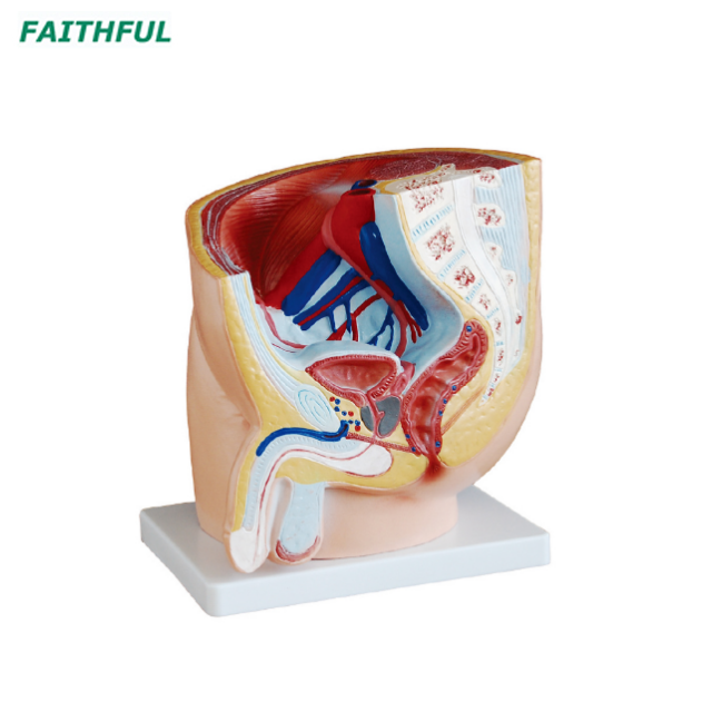 Ce modèle de section médiane montre la position normale des organes génitaux masculins avec la vessie et le rectum dans le bassin masculin. Fait de PVC.