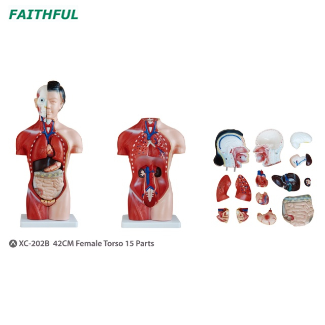 Ce torse femelle comprend 15 parties, y compris le torse, la tête (2 parties), le cerveau, le poumon (2 parties), le cœur (2 parties), l'estomac, le foie, le rein, le pancréas et la rate, l'intestin, les organes génitaux féminins (2 parties). Fabriqué en PVC Plastic.mounté sur une base en plastique. Taille: 42 cm.