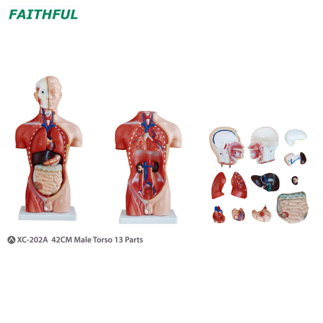 Ce torse mâle comprend 13 parties, y compris le torse, la tête (2 parties), le cerveau, le poumon (2 parties), le cœur (2 parties), l'estomac, le foie, le rein, le pancréas et la rate, l'intestin.made de plastique PVC. Monté sur une base en plastique.